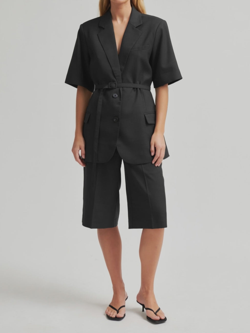 Second Female kortærmet blazer. Blazeren er fremstillet i let materiale i let melangekvalitet. Knaplukning, stofbælte og vatterede skuldre. Klaplommer og slids bagpå. Helforet. Normal, lige pasform.