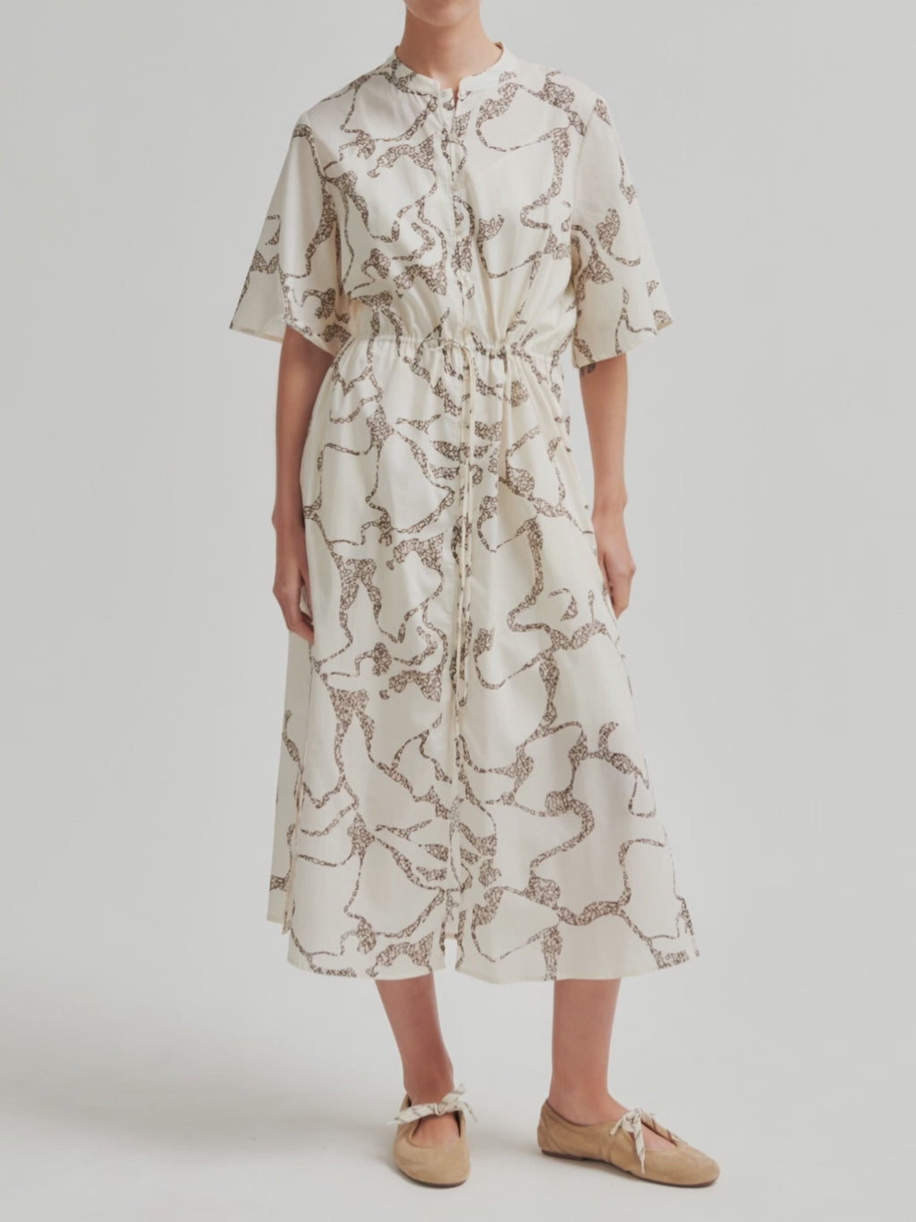 Second Female kjole med print. Kjolen er fremstillet i semitransparent bomuld med gennemgående print. Gennemgående knaplukning og bindebånd i taljen. Korte ærmer med svaj. Skjulte sidelommer. Foret til knæene. Normal pasform.